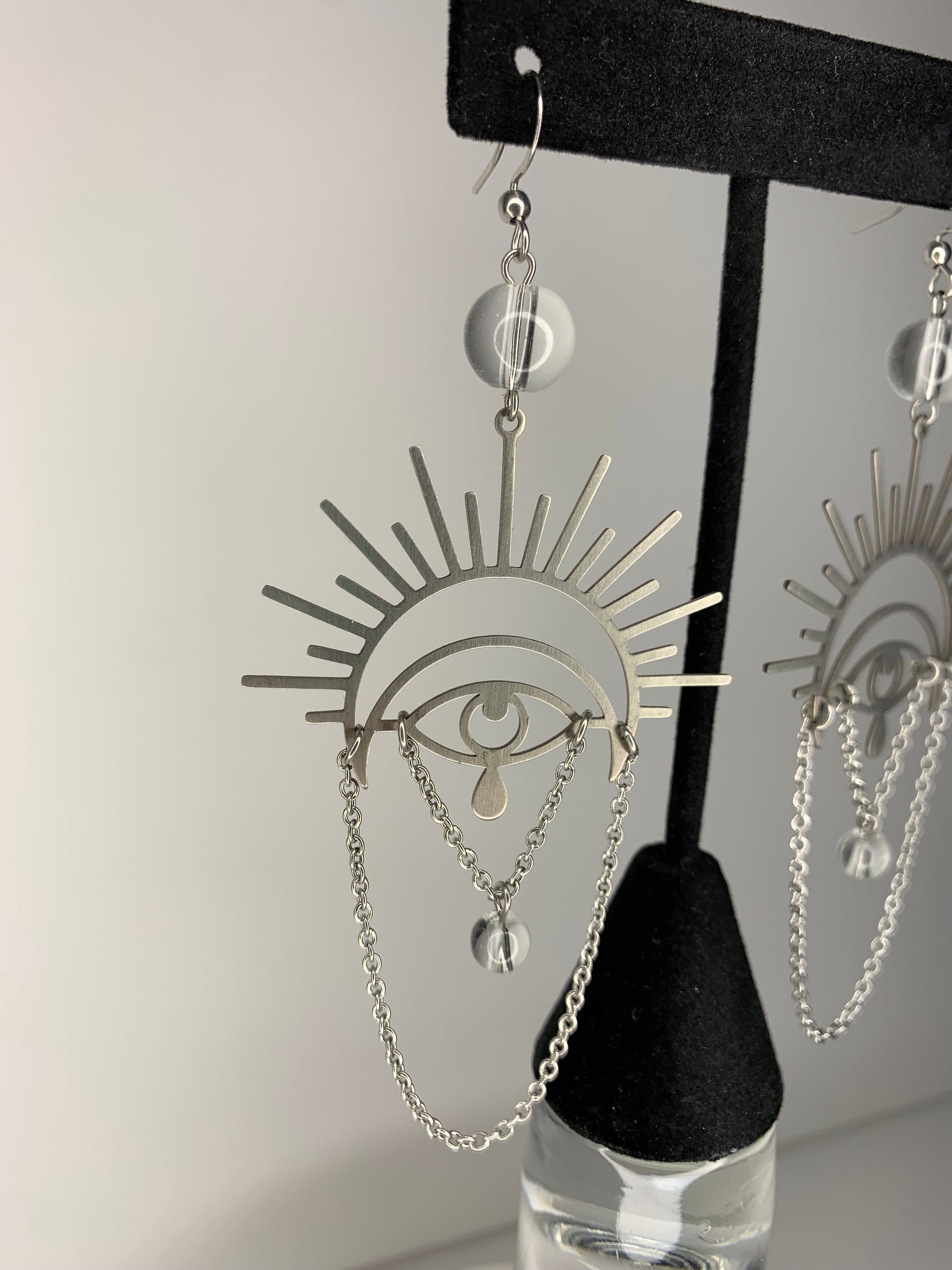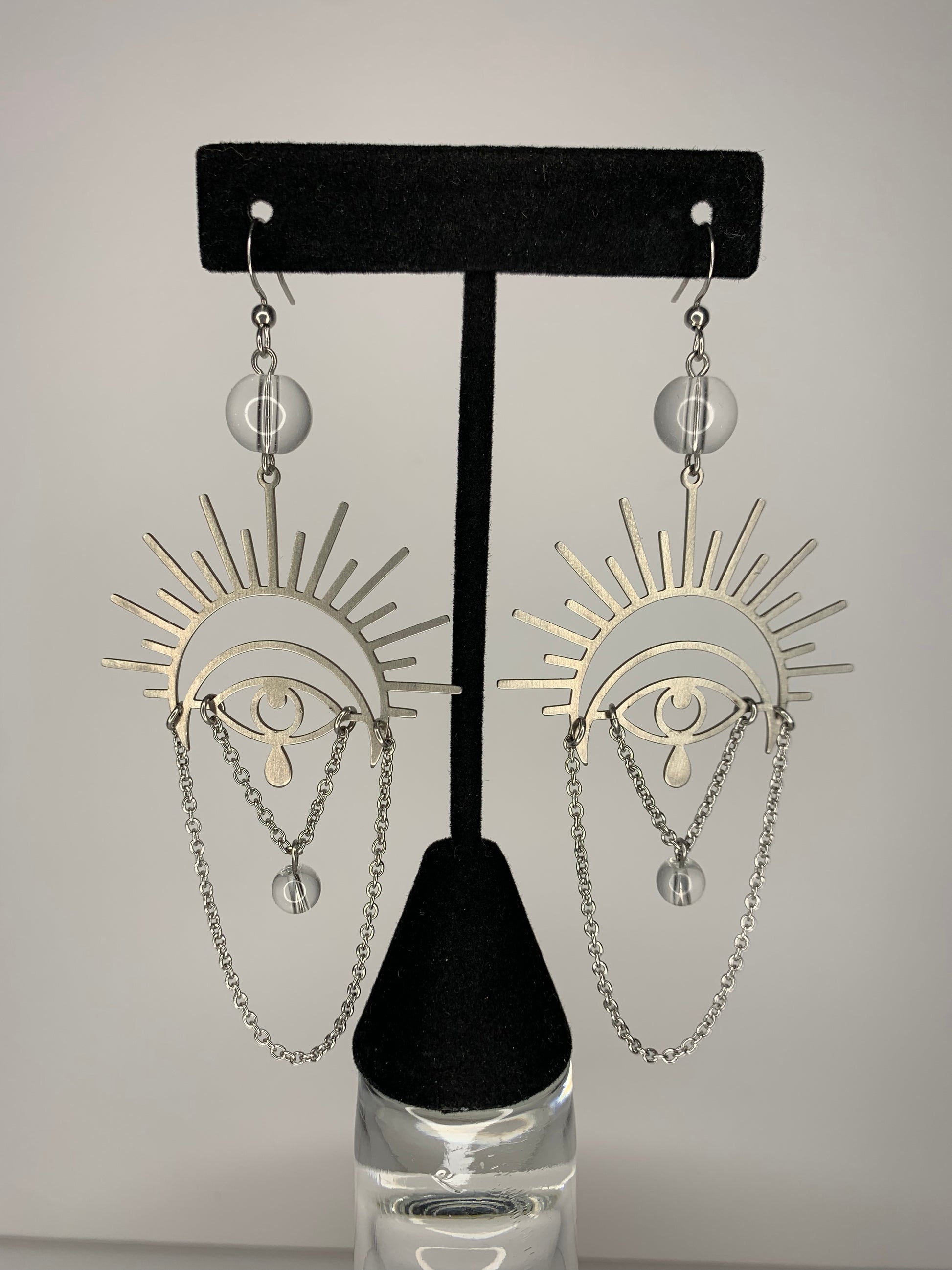• Silver style is a completely %100 stainless steel earring set from the hooks, chain, wire and the eye charm it self. It’s accompanied with clear glass beads