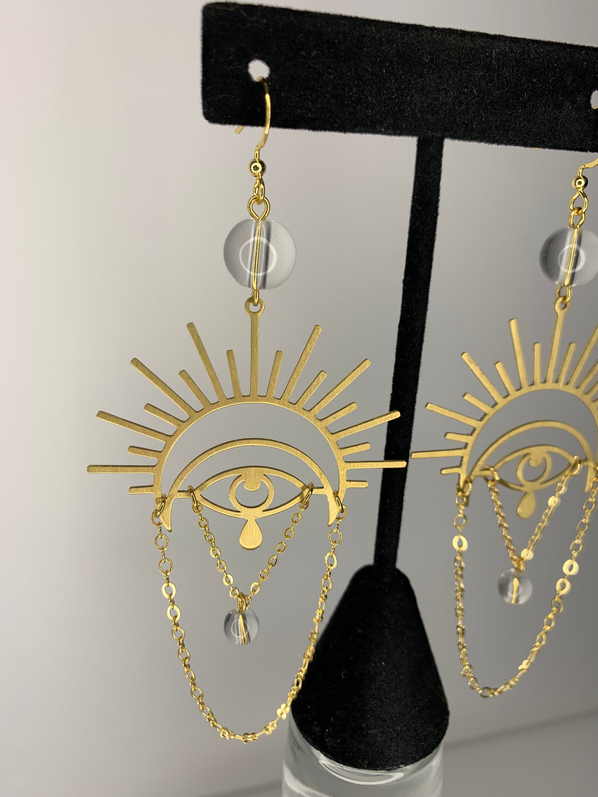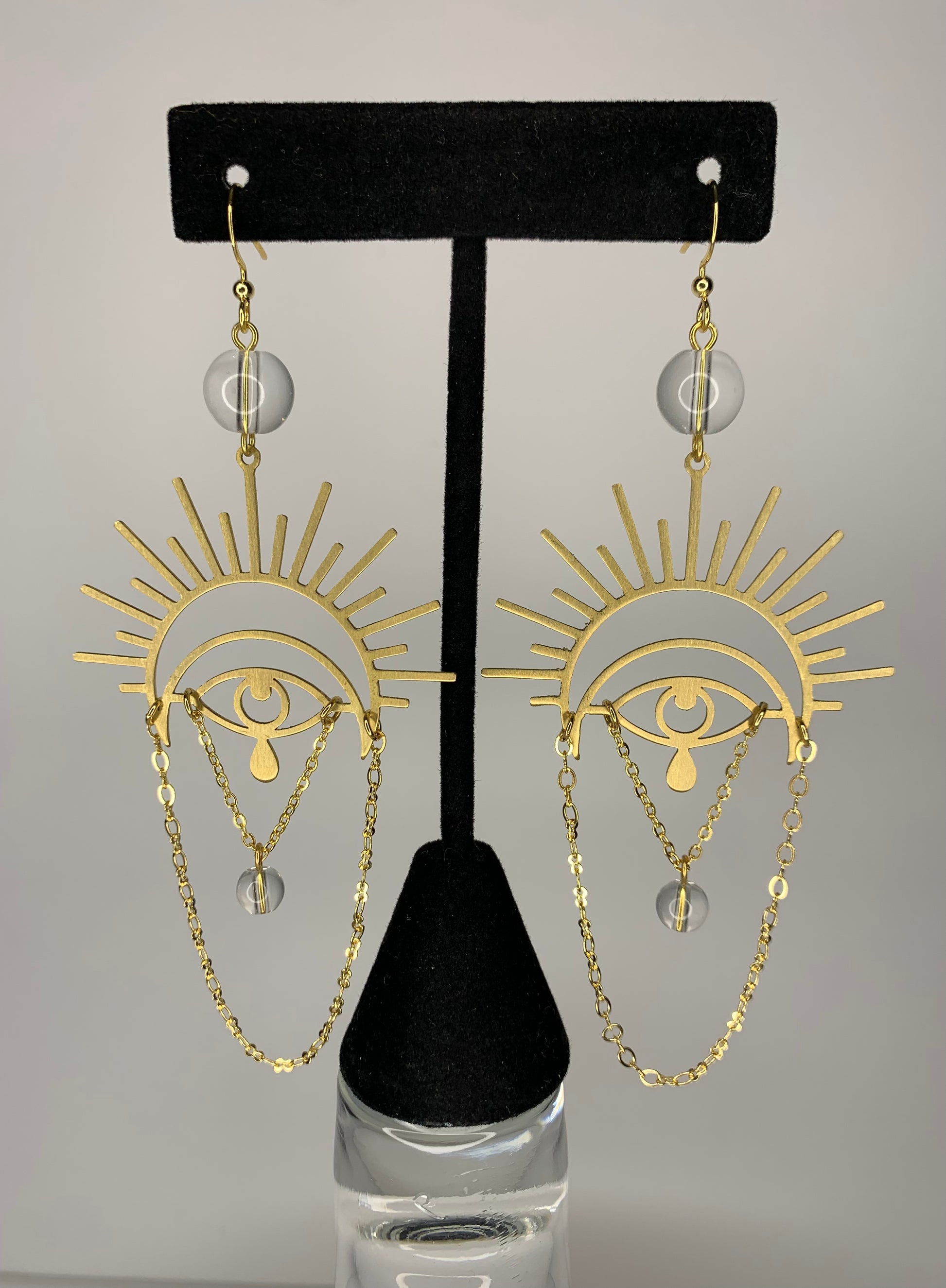 • Gold style is made with 18k gold dipped hooks, chain, wire and jump rings. Eye charm is made from brass. It’s accompanied with clear glass beads.