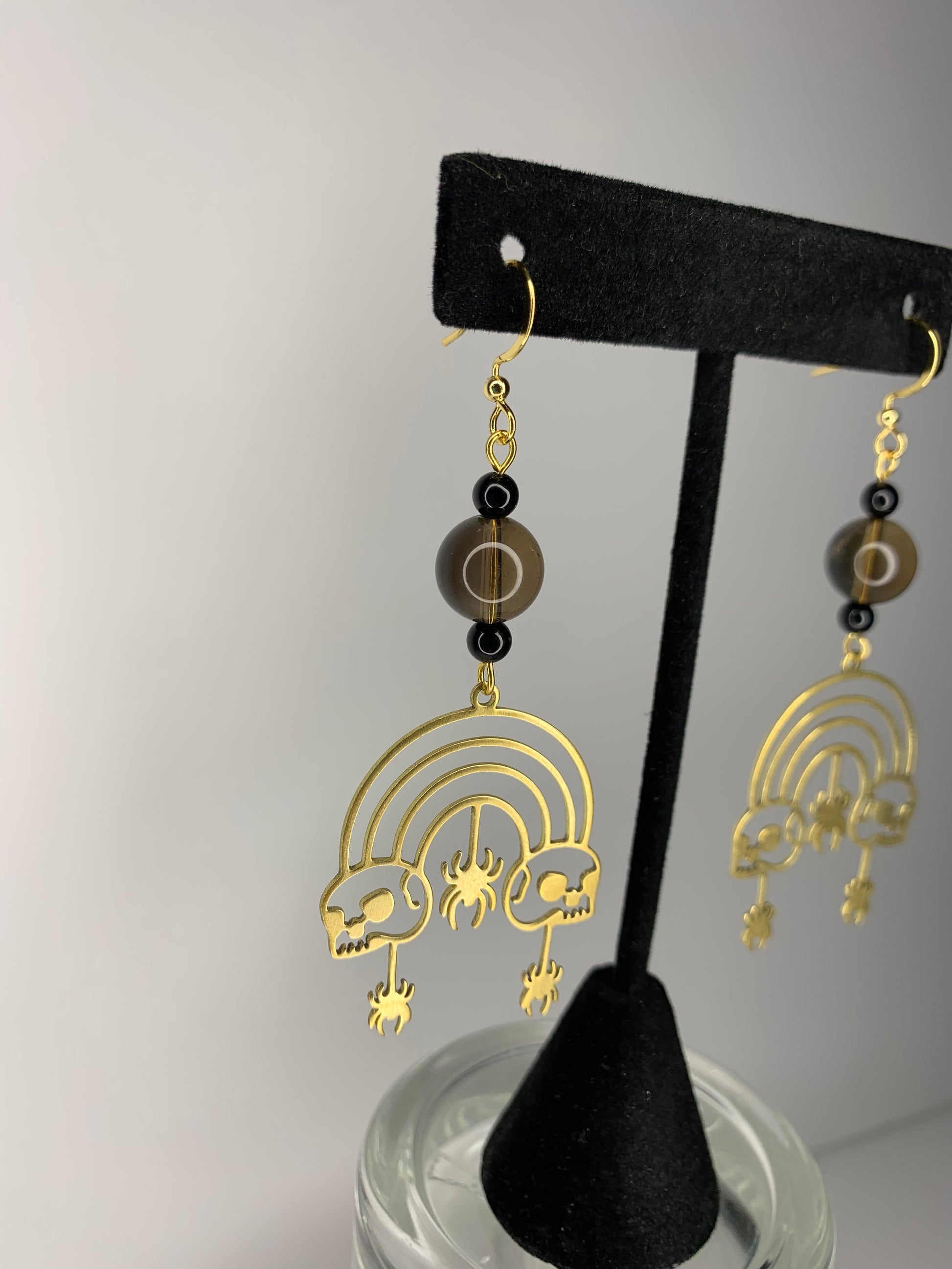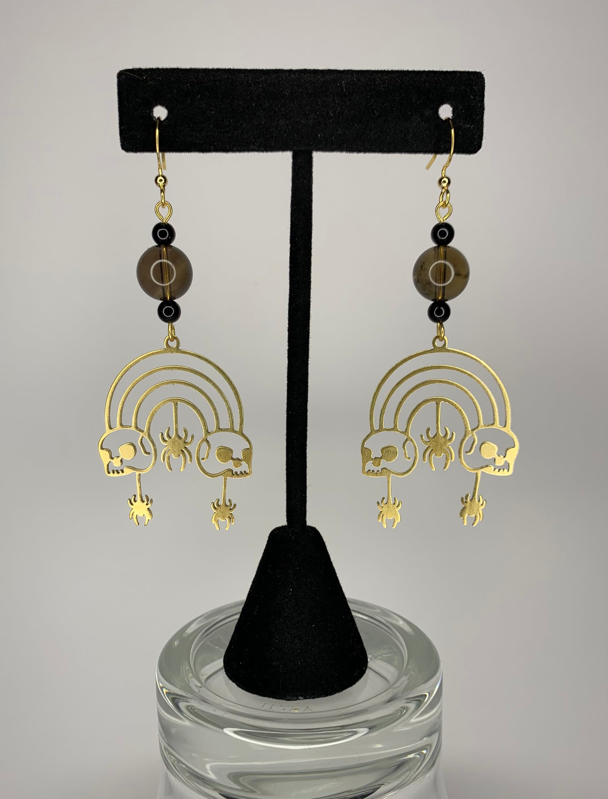 • Made with 14k gold dipped hooks, chain, wire and jump rings. Gold charm is made from brass. It’s accompanied with semi-precious stone beads (Onyx and Smoky Quartz) and glass beads.